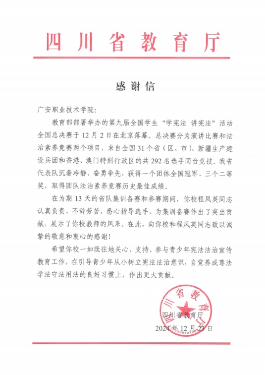 2024年12月23日,四川省教育厅向我院教师程凤英发来感谢信,对程凤英在教育部部署举办的第九届全国学生“学宪法 讲宪法”活动全国总决赛中积极提供重要的人力支持,高质量完成相关工作给予高度认可和积极鼓励。